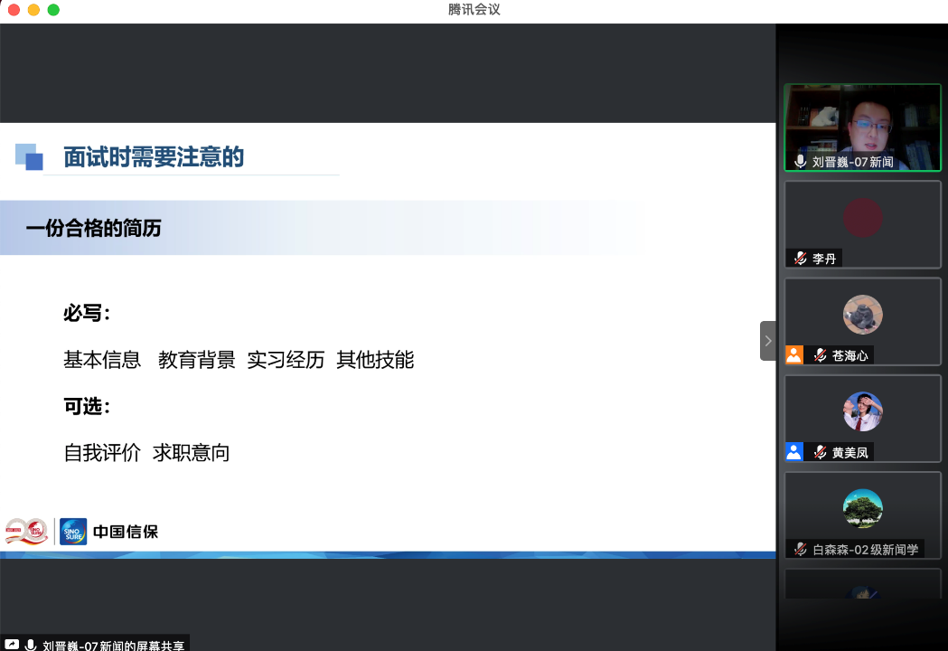 2021年6月2日晚,公司“职属新传”职业分享沙龙第九期国企专场以线上形式和大家见面。本期沙龙邀请到两位重磅嘉宾,分别是w66利来旗舰厅2002级本科毕业生白森森师兄和2007级本科毕业生刘晋巍师兄。两位师兄结合自身求职经验与工作经历为我们分享包括国企面试心得、就业情况等多方面实用信息,帮助我们更深入地了解国企就业现状,以便更好地作出规划。