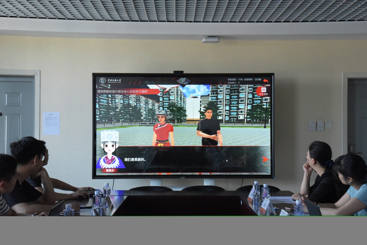 项目合作方百朋索奇公司对虚拟仿真实验进行了验收展示。汇报围绕着虚拟仿真实验教学项目的建设内容、建设成果、建设完成度、后期规划展开,并对整个虚拟仿真实验过程进行了实操演示,模拟了员工在差异性区域条件、交通不便利环境下前往民族地区偏远县域开展融媒体中心调研及实务操作的内容。