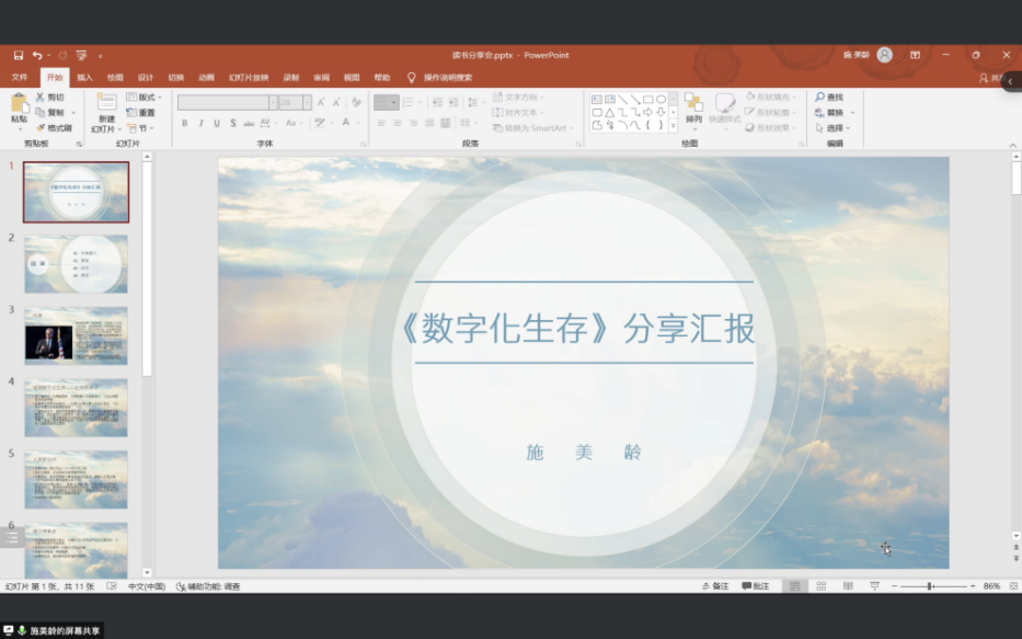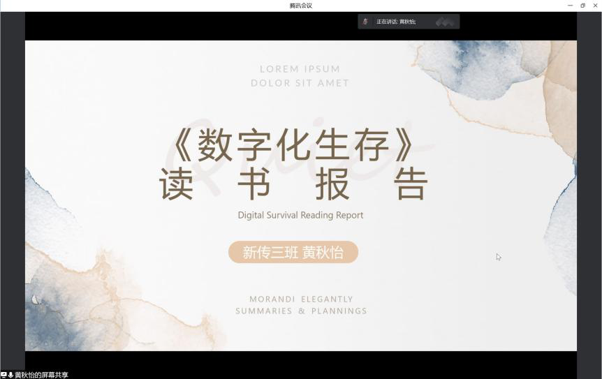 黄秋怡同学通过书目介绍、佳句分享以及个人感想三个部分,具体地解释了什么是数字化以及科技发展带来的变化,并分享了对数字化生存之下的阴暗面、数字化带来的欲望扩张以及人类自控力的思考。