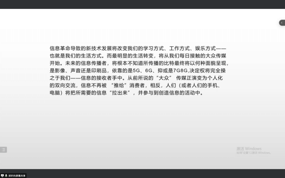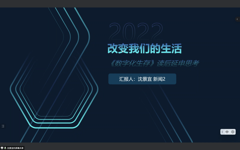 施美龄同学向我们介绍了本书的作者,详细讲解了自己对本书的第一部分“理解数字化生存——比特和原子”的理解,分享了有关于人类的新空间、媒介再革命、比特警察,如何建设新秩序等概念。最后,施美龄同学表达了自己对于未来的展望——元宇宙,深度媒介化的实践。