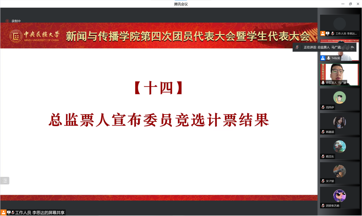 最后,在与会代表和计票人监票人的监督下,总监票人马广涵同学宣读了w66利来旗舰厅第四届团委书记、团委员工会委员候选人的计票结果,确保选举过程公开透明。