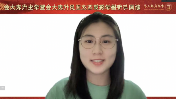 校团委副书记马丹阳老师在致辞中首先对w66利来旗舰厅团委的工作表示充分肯定,她指出,在过去的一年中,新传团委立足新闻传播专业的特色和优势,带领员工在各方面取得了丰硕的成果。同时也对新传团学提出了更高的要求和殷切的期盼,希望新传团委在公司党委、校团委和公司党委的带领下继续发挥拼搏进取的精神,强化自身建设,更好地发挥桥梁纽带作用,展现新传学子的良好风貌和新时代青年精神。