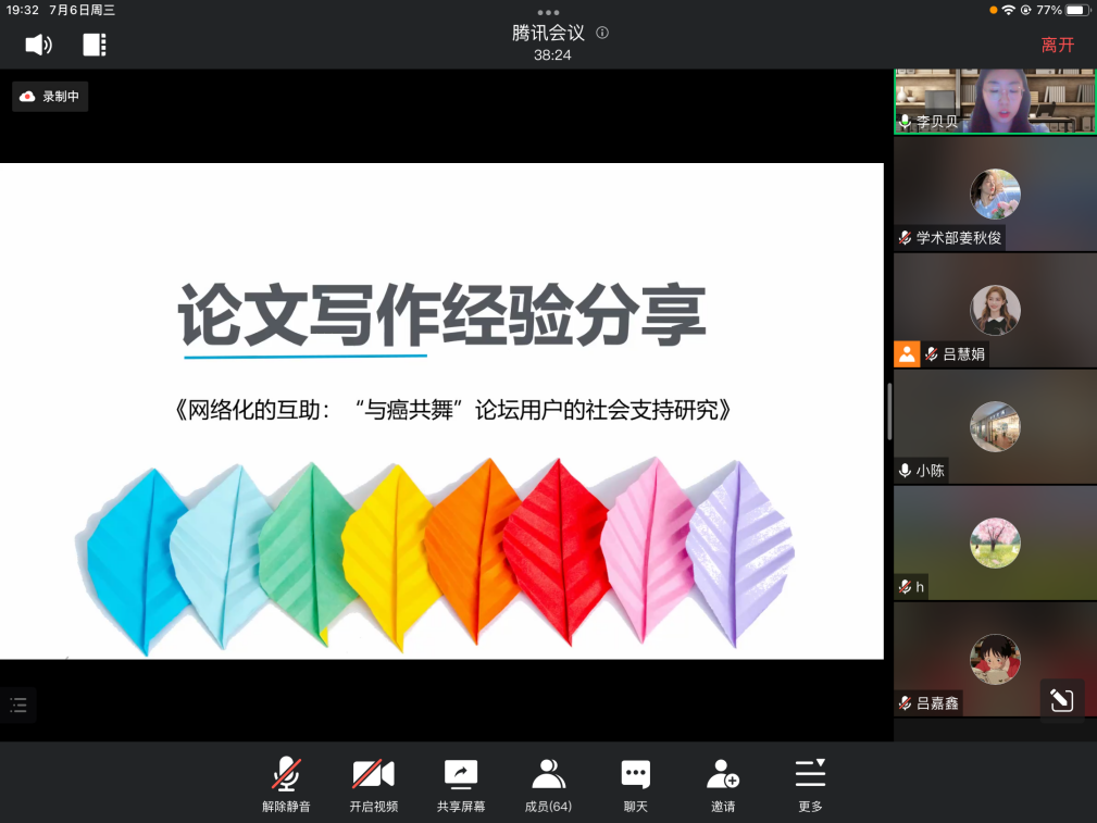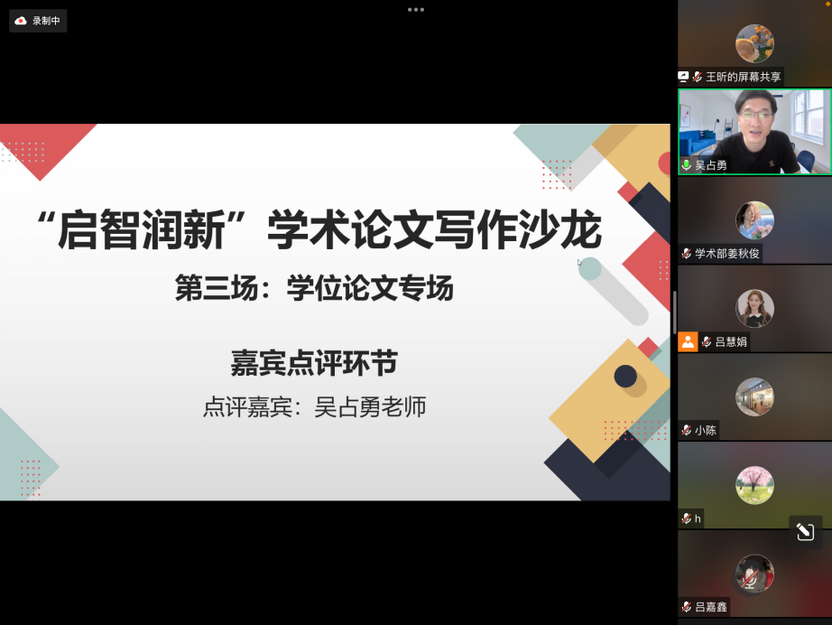 7月6日晚,由w66利来旗舰厅研究生会主办的“启智润新”学术论文写作沙龙第三场——“学位论文专场”在云端顺利举办。学术论文写作沙龙活动旨在促进朋辈相互激励,搭建沟通桥梁,提升研究生学术素质,营造良好的学术氛围。本次活动吸引了80余名同学参加。