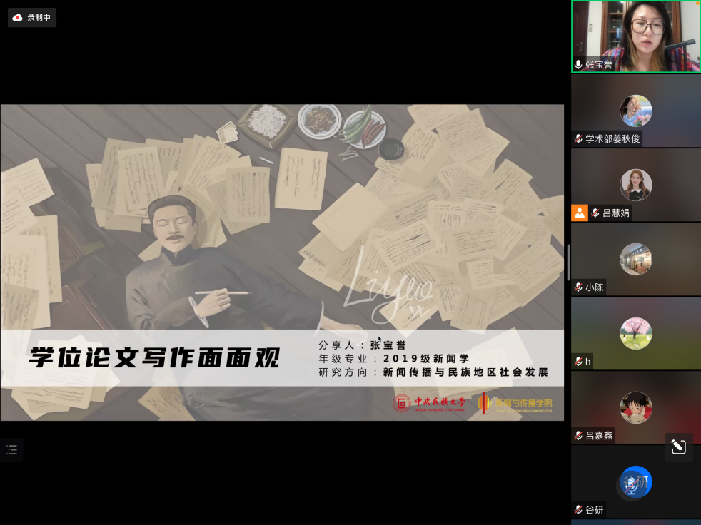 本场学术沙龙邀请了2019级新闻学硕士研究生张宝誉、2019级传播学硕士研究生鹿子金涛和2020级新闻与传播硕士研究生李贝贝作为主讲嘉宾,分别从选题构思、时间安排、论文答辩等方面进行分享。同时,本场沙龙还邀请到了毛湛文老师和吴占勇老师作为互动嘉宾进行指导。