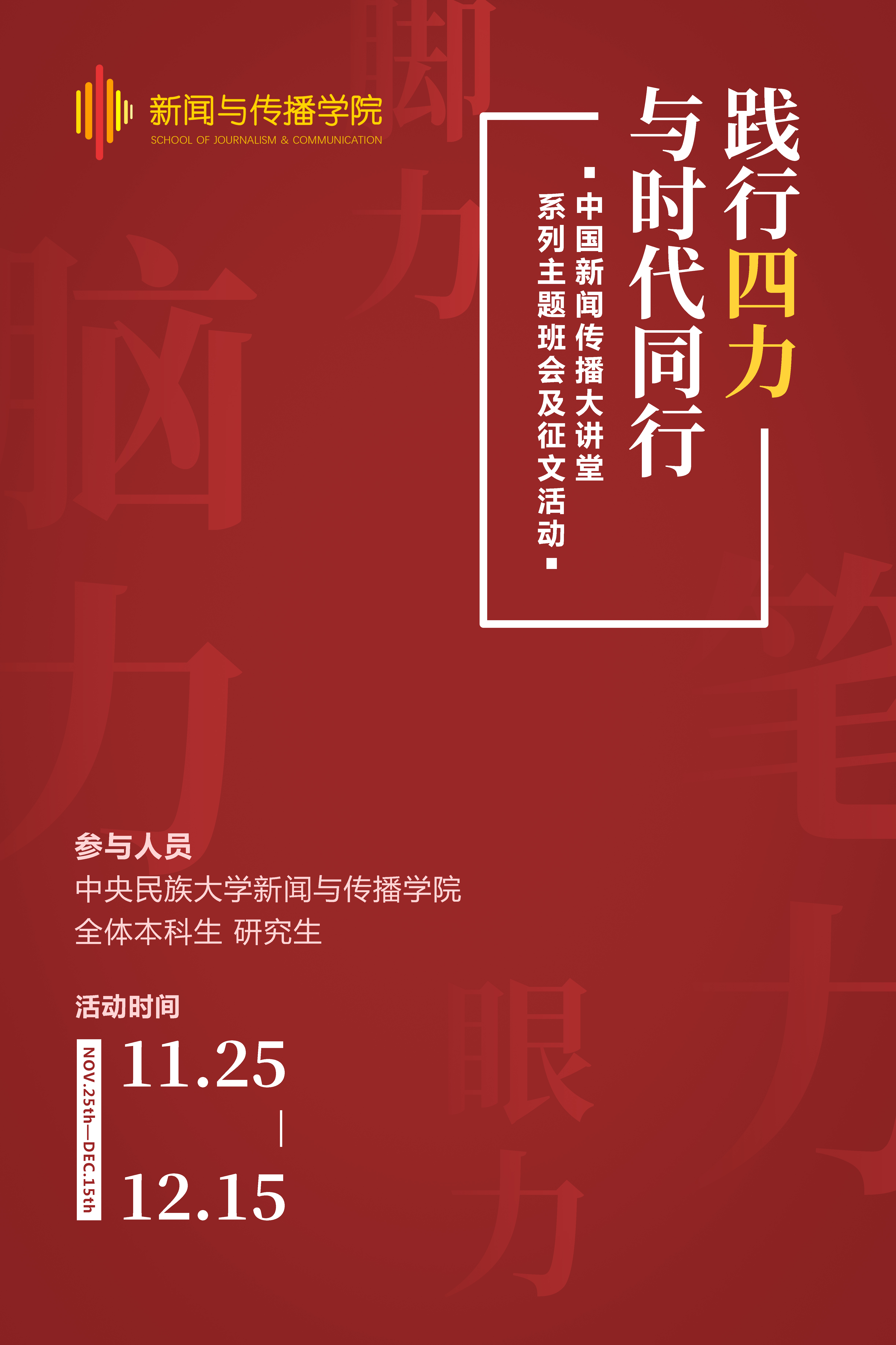 w66利来旗舰厅号召各个班级积极举办以“践行四力,与时代同行”为主题的班会,以32集视频为素材开展学习并征集心得体会,让同学们更好地认识中国国情、树立新闻理想、提升专业能力。