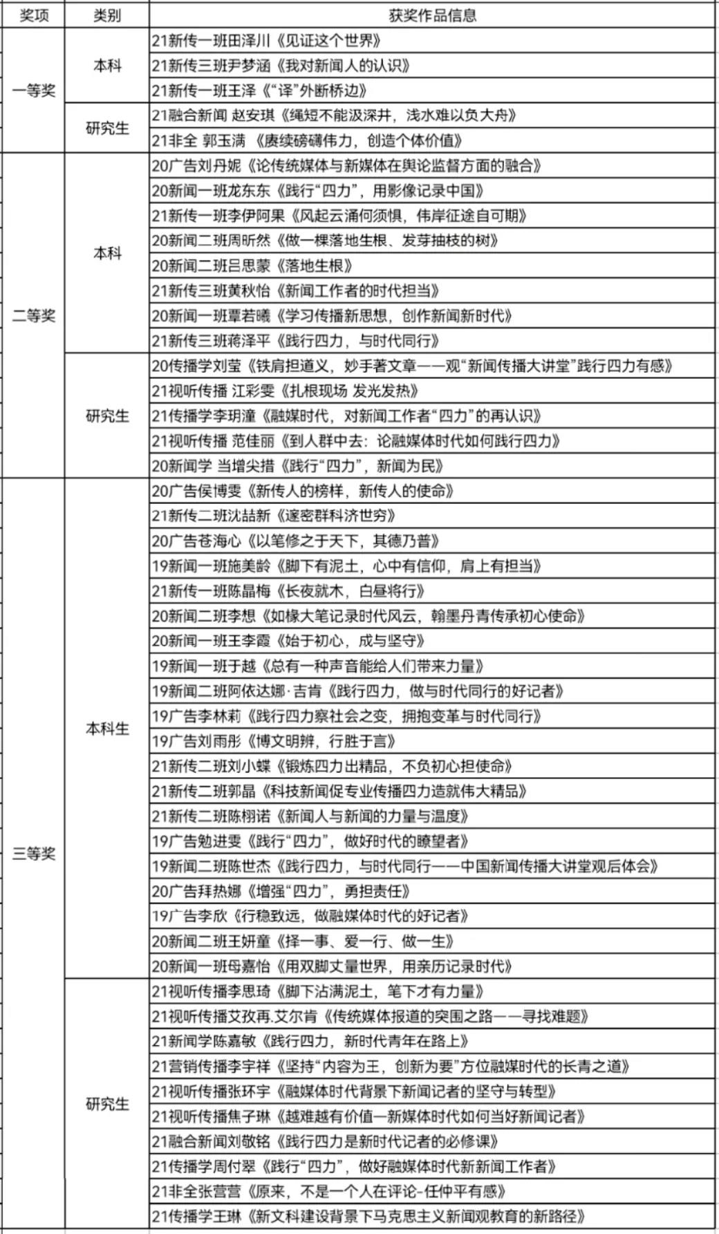 新时代的新闻学子应在“大课堂”引导下,记录时代风云,勇攀“四力”高峰,认清中国国情、增强道路自信、树立新闻理想、提升专业能力,努力成长为有理想、有情怀、有担当、有本领的新闻传播人才,厚积薄发、不负韶华,为中华民族伟大复兴的壮美长卷绘就绚烂篇章。