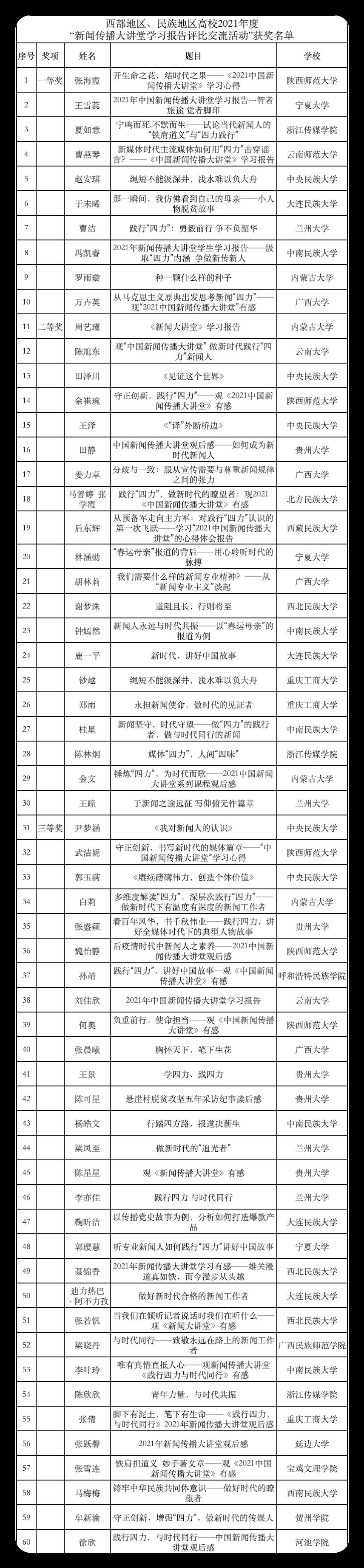 为全面落实立德树人根本任务,加快推进新文科建设,培养卓越新闻传播后备人才,加强西部地区、民族地区高校新闻传播院系协同育人机制建设,推动优质教育资源共建共享共用,2021年12月,西部地区、民族地区高校“共上一堂马新观课”暨2021年“新闻传播大讲堂”学习报告评比交流活动正式启动。