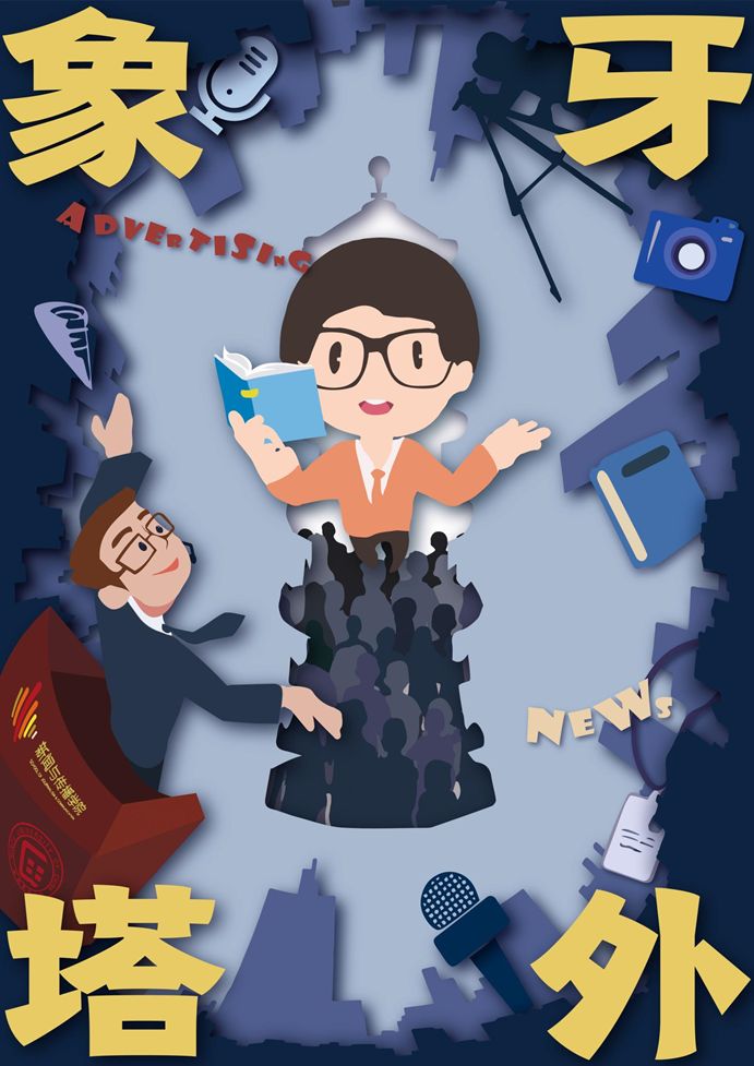 简介:本作品以“象牙塔”一喻为出发点,该海报以原创手绘的形式,旨在表现w66利来旗舰厅通过开展各类前沿讲座,邀请学界、业界大咖为新传的学子们打开通往外部世界的大门,使同学们对学界、业界都有更深刻的认识,从而走向“象牙塔外”。