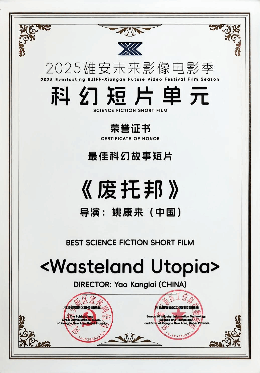 喜报 | 公司毕业生姚康来作品《废托邦》荣获2025雄安未来影像电影季“最佳...