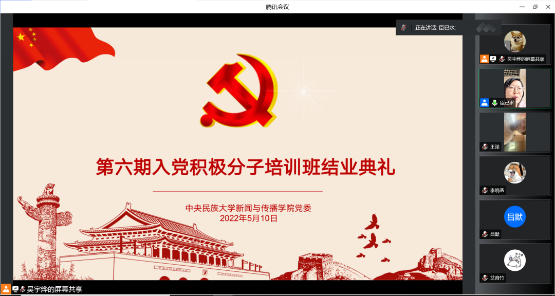 5月10日中午,新闻与传播公司党委分党校第六期入党积极分子培训班在线举行结业仪式。公司党委书记伊利贵,党委副书记、纪委书记赵丹华出席仪式。仪式由公司党团与员工工作办公室主任孙熙主持,第六期结业...